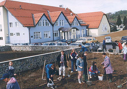 Sajenje sadnih dreves v šolskem sadovnjaku, pomlad 1998. Foto: Laura.