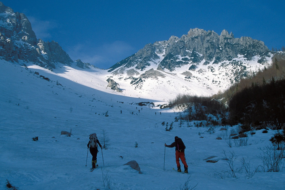 Široko smučarsko pobočje pod sedlom Vrtača. Desno Svačica.