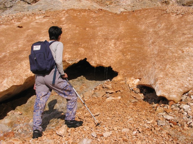 Rdeči sneg pod slapovo steno.