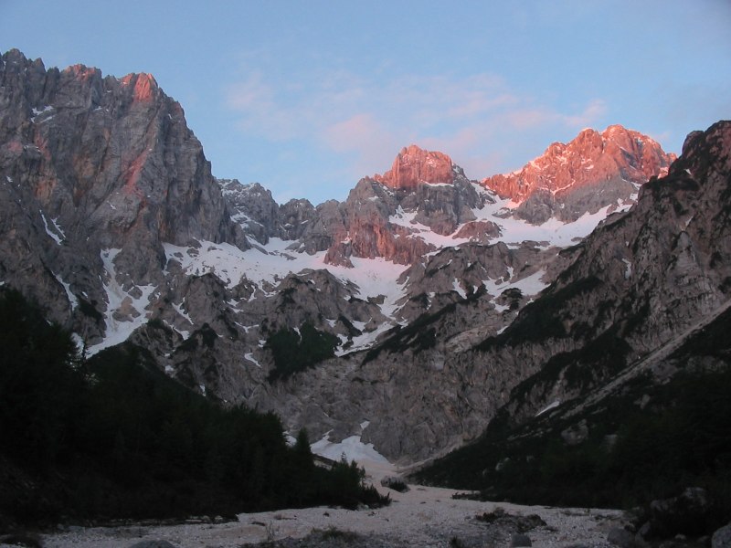 Jutro. Venec vršacev nad krnico Za Akom (Široka peč, Mali Oltar, Velika Ponca).