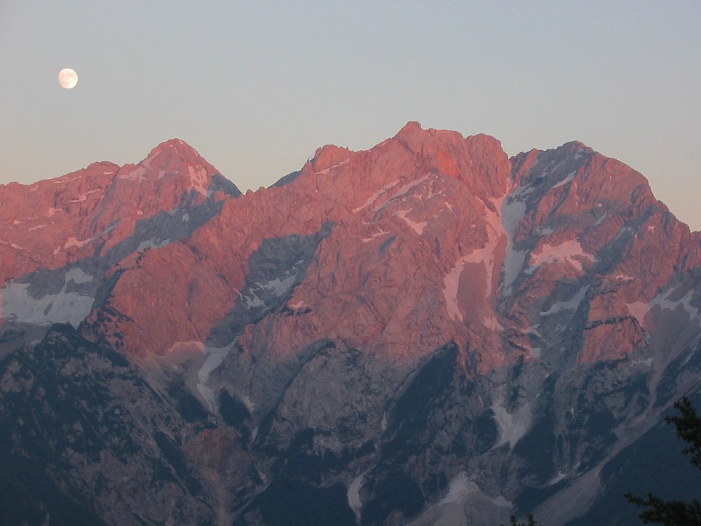 Razgled z vrha ob 20h55: Grintovec in Kočna.
