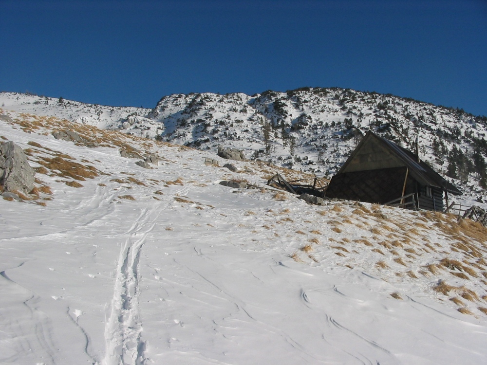 Koča na Dolgi njivi, zadaj hrbet Cjanovce.
