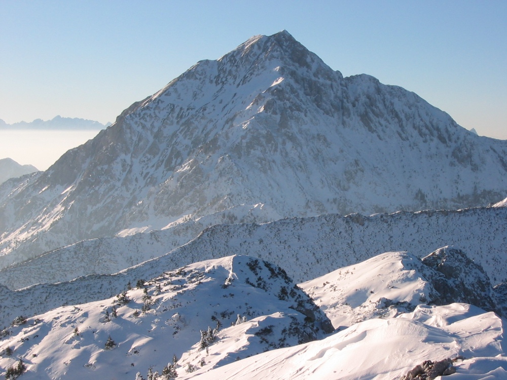 Storžec. Raztegnjeni greben v ospredju je Lanež, za njim krajši hrbet Bašeljskega vrha.
