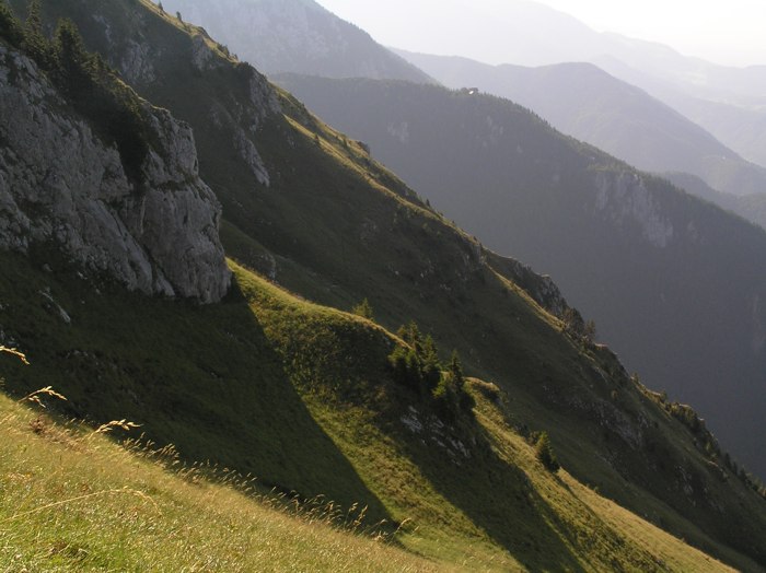 Začetek prečne lovske steze z JZ grebena. Levo spredaj nezgrešljiva monolitna stenica nad gamsjim "hotelom", v ozadju Dom na Kališču.