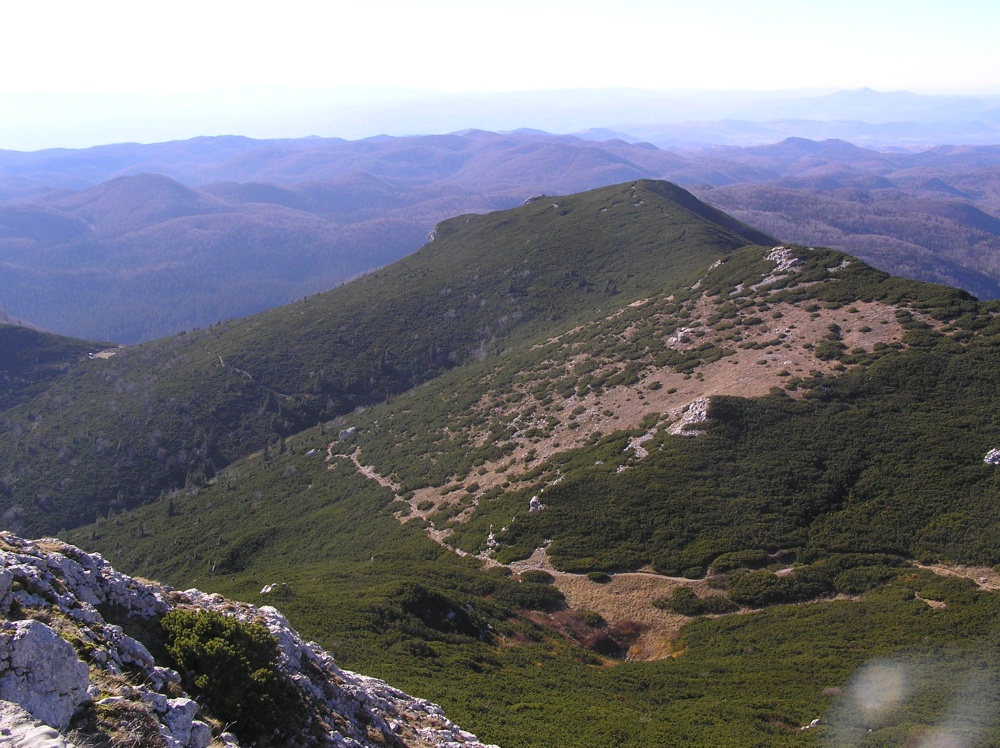 Pogled z vrha na Mali Snežnik. Levo spodaj obračališče na koncu ceste.