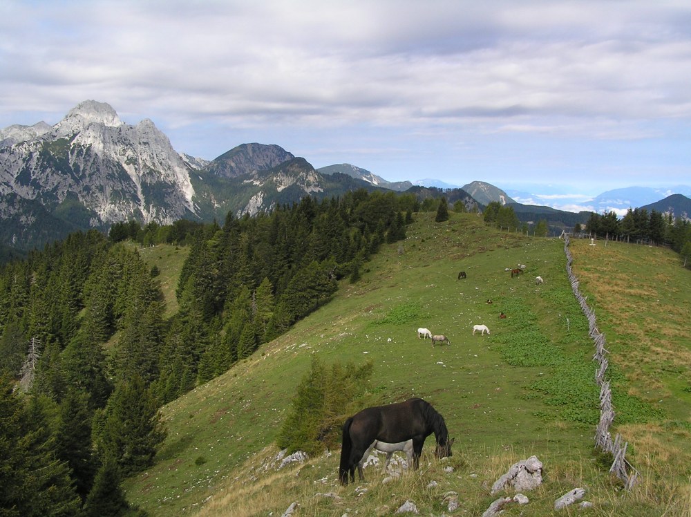 Obmejni pašnik na Rjavi peči. Zadaj Vrtača, Palec, Kozjak, Rjavca, ...