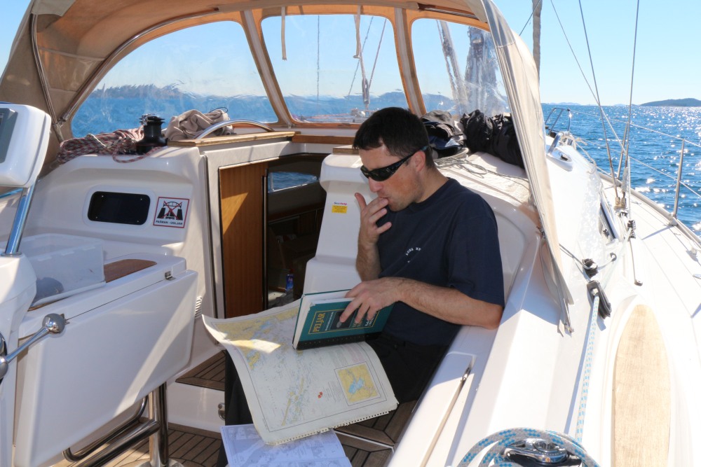 Kapitan, obložen s svojo strokovno literaturo, si oblizuje prste po odličnem štrudlu.