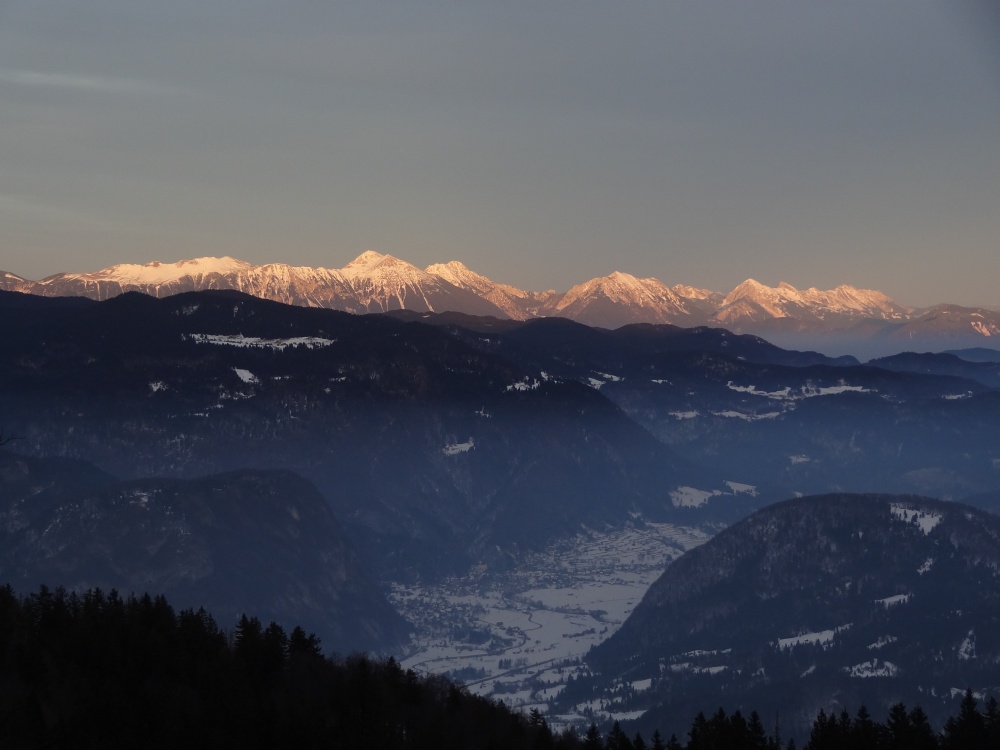 Pogled čez Zgornjo Bohinjsko dolino proti Karavankam.