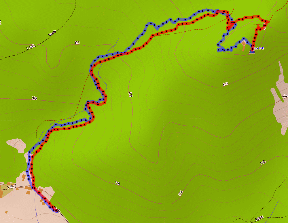 Potoki - Ajdna. Rdeča = zavarovana pot, modra = stopnice.