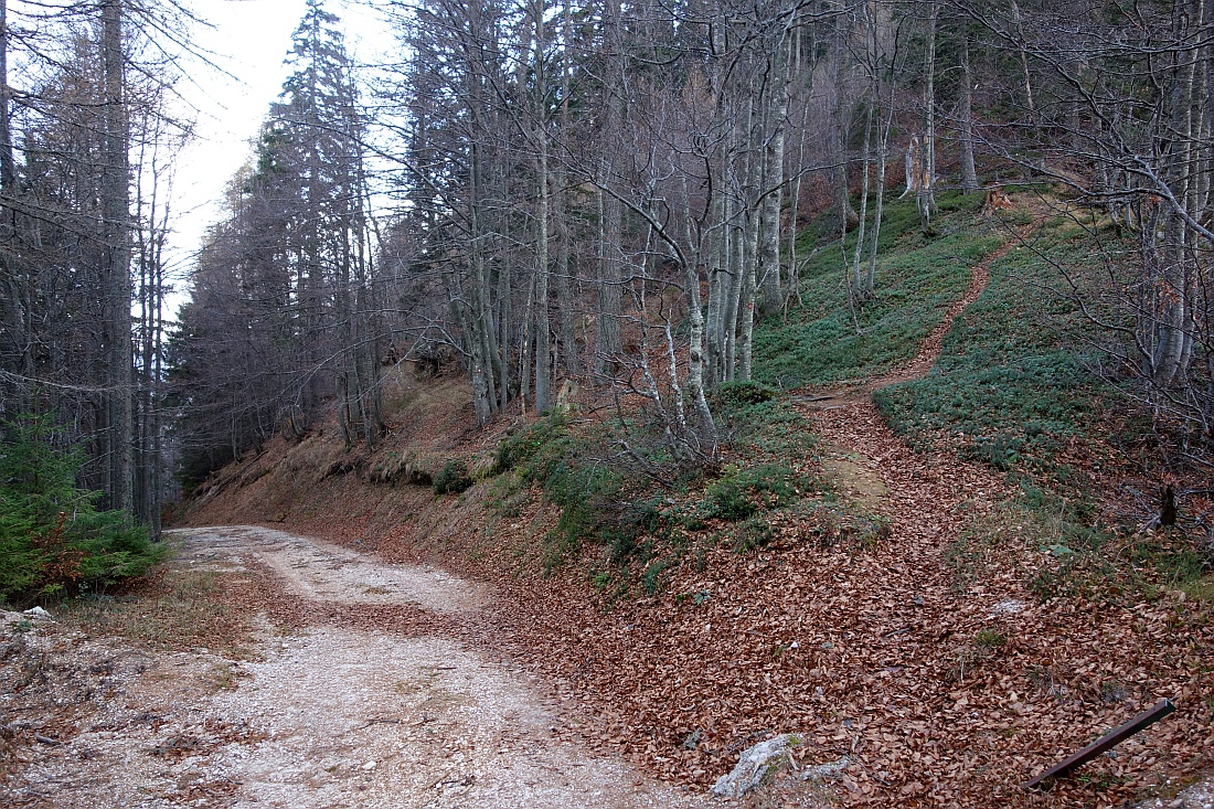Sedlo za Belo pečjo: vodoravno nad cesto preči SPP, po grebenu navzgor pa pelje stezica na vrh Bele peči.