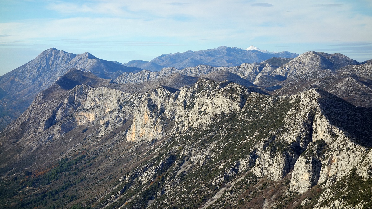 Glavni greben Rilića (na levi najvišji vrh Sutvid), zadaj vršna planota Biokova z zasneženim Sv. Juretom.