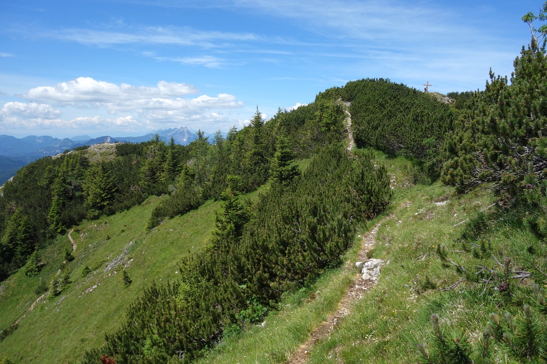 Desno križ na koncu vršnega grebena Obel kamna, na levem pomolu stolpiček TK Gora.