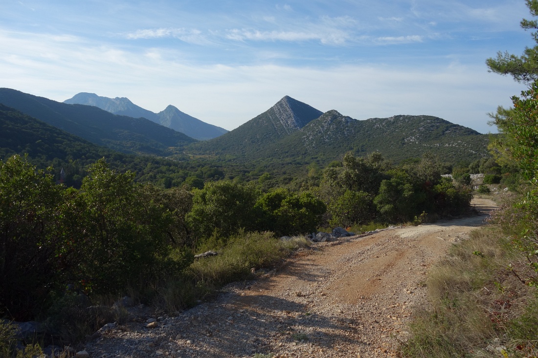 Pogled od Paškala na najvišji vrh Pelješca, Sv. Ilijo. Desno od njega sta Rasme in Čašnik. Bližnja špica na sliki je Velji vrh.