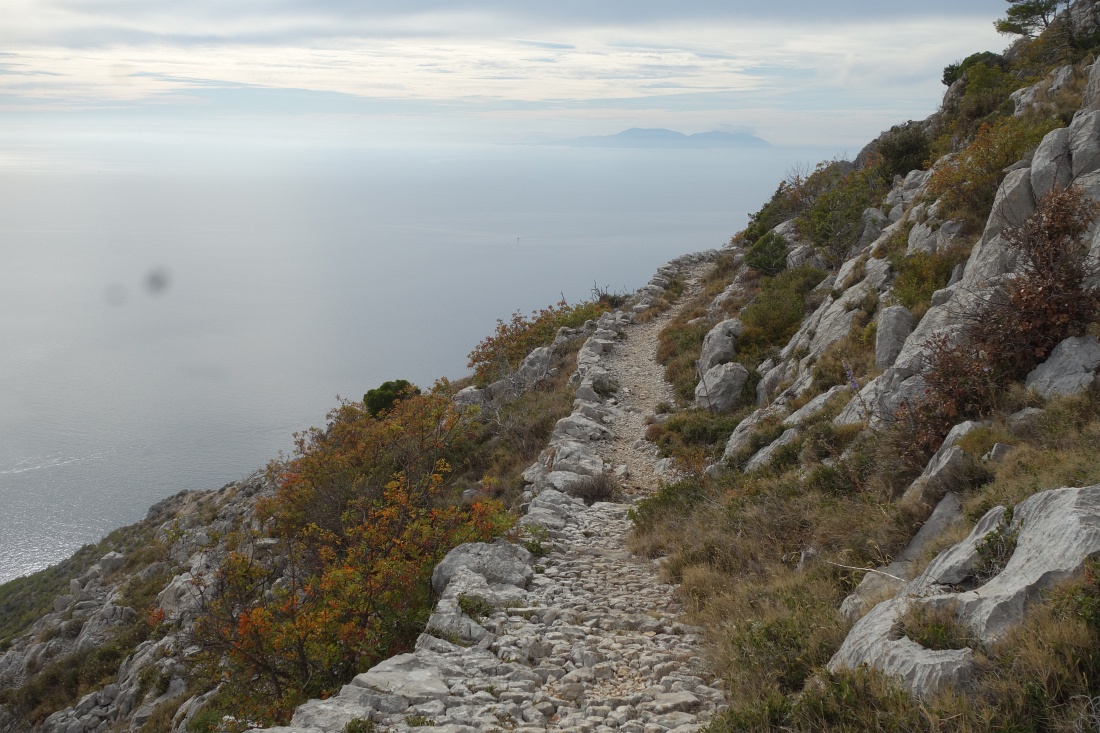 Utrjena pot s Poljice proti Sv. Nedilji. V ozadju otok Vis.