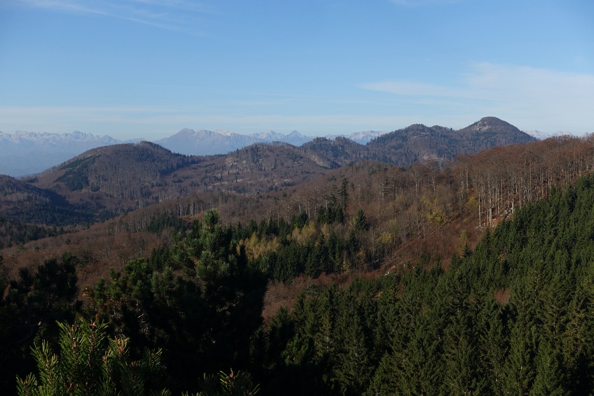 Vrhovi sredi Trnovskega gozda: Črni vrh - Mrzovec. V ozadju Krn.