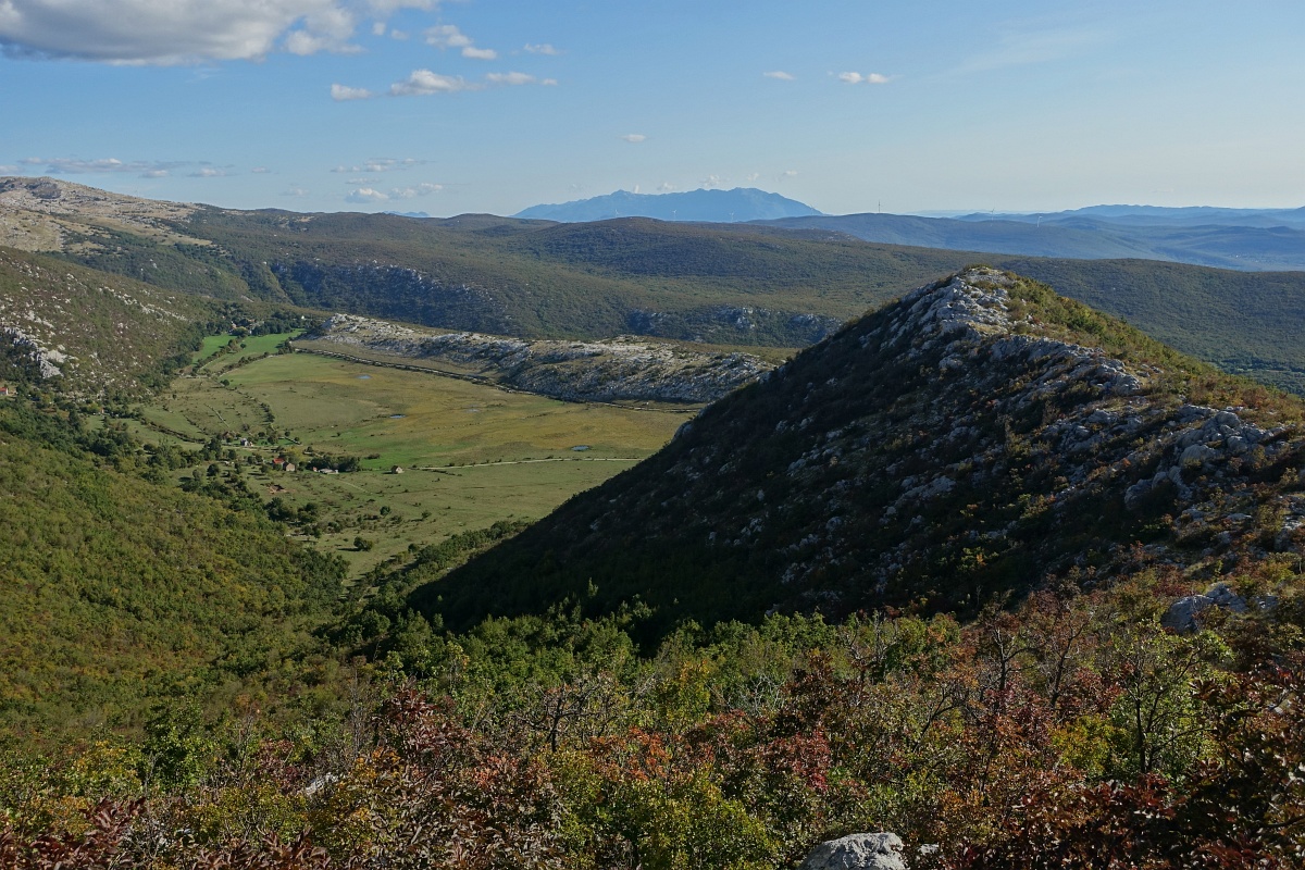 Polje Blaca pod Glavašem. Desno Gradina, v ozadju silhueta Biokova.