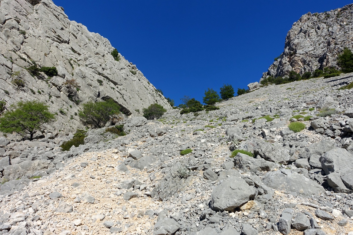Melišče nad kamnolomom. Vzponska steza vijuga ob steni!