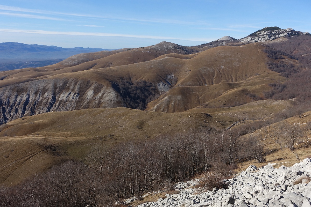 Osrednja skupina Grobniških Alp: Dnič, Suhi vrh, Fratar. Desno spredaj travnati Vidalj.