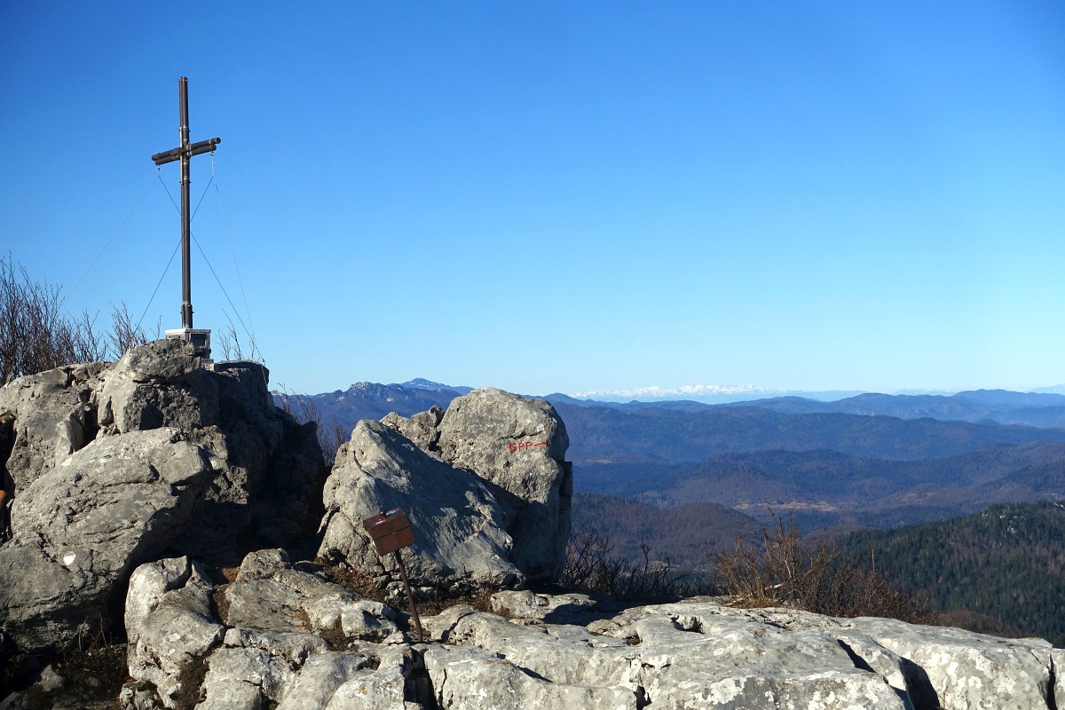 Razgled z vrha: levo Risnjak in naš Snežnik, desno na obzorju Triglavsko gorovje.