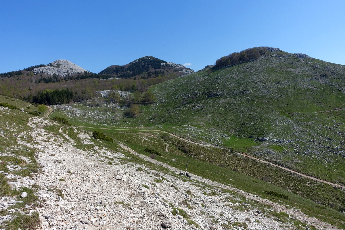 Hahliči. Z desne: Dnič, Fratar, Suhi vrh. Planinski dom Hahliči se skriva v smrekovem gozdičku na levi.