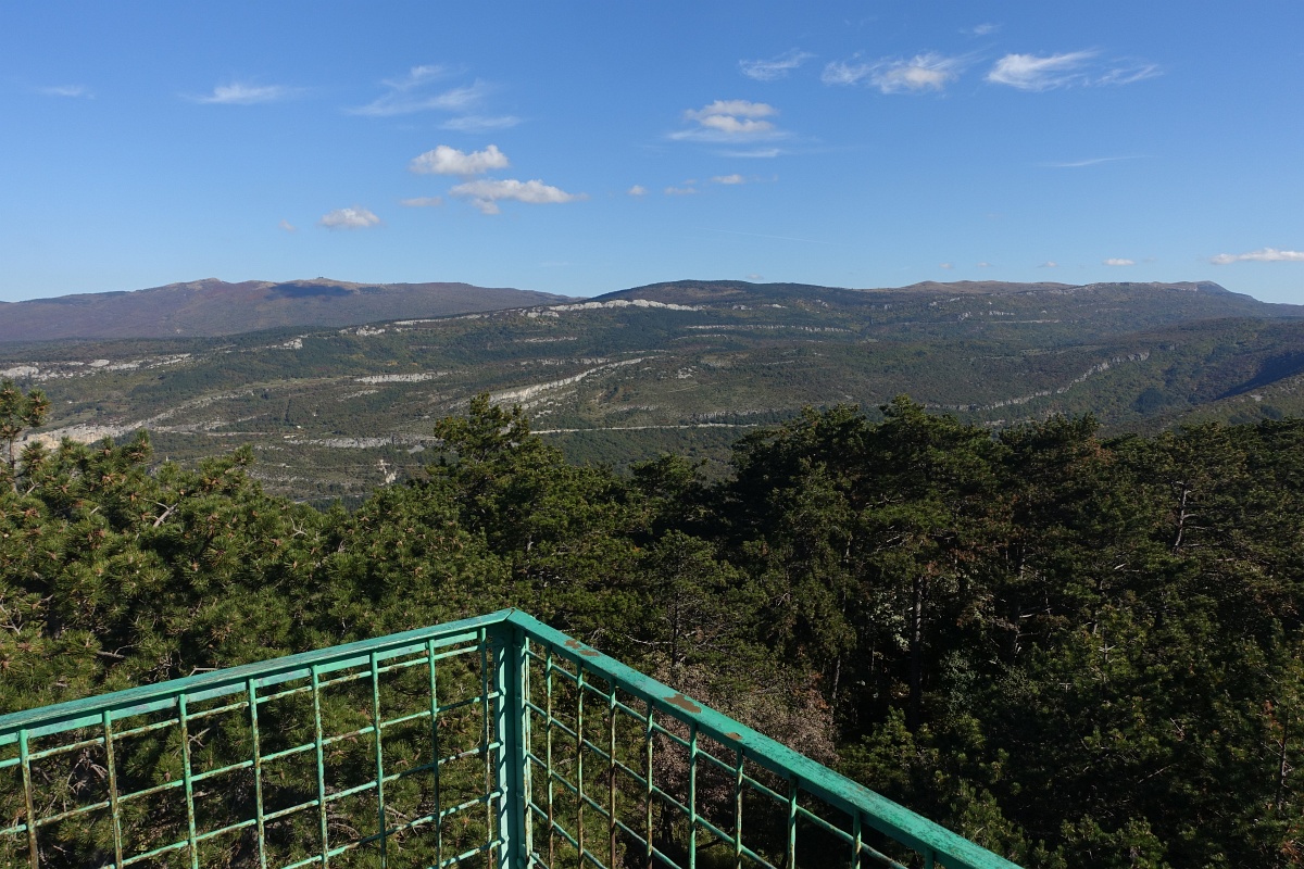 Na razglednem stolpu na Lačni: pogled na Slavnik in Goliče.