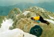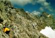 Prek kopne travnate rame pod Dolkovo špico sva še uživala v fantastičnem razgledu na Stenar, Triglav, Cmir, Škrlatico pod popolnoma jasnim nebom, potem pa se je začelo mučenje na snegu. Prečenje je bilo še znosno, dolek pod Škrlatico pa je bil pravi parni kotel. Snežna strmina, ki ji ni bilo konca, sonce, ki naju je žgalo skoraj direktno v hrbet (na snegu seveda okrepljeno), ter zrak, ki ni niti mignil. Za povrh sva bila oba brez očal; jaz sem se vsaj malo zaščitil s trenirko čez glavo. Na prelomnici sva počivala, sledilo je še zadnjih 100 m garanja po snegu in potem sva končno dočakala SENCO! Čez steno, kjer sva mislila, da bo najtežje, je bil najlepši del poti - najprej olajšanje v senci, nato užitek v suhi skali. Snega, ki sva se ga bala, ni bilo, stena je bila kopna. Edino pod škrbinico je bilo nekaj ledu, ki sva ga previdno prelezla. Skratka, čisti užitek v fantastičnem vremenu (vročine zgoraj ni bilo več) in razgledu. A to je veljalo le zame, kajti Marjana je sonce na snežiščih tako uničilo, da je povsem pregorel. Čisto počasi sem ga ob 11:15 komaj prišlepal na vrh. Razen nekaj krajših odsekov, kjer je bilo zaradi južnega snega treba stopati kar previdno, je bil tudi greben kopen.