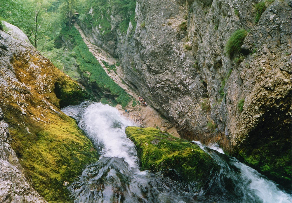 Pogled od izvira slapu Savica proti njegovemu vznožju.