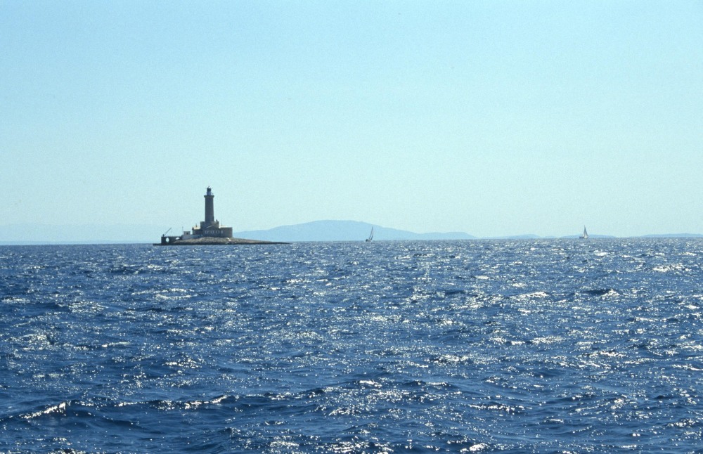 Svetilnik Porer, zadaj obris Lošinja.