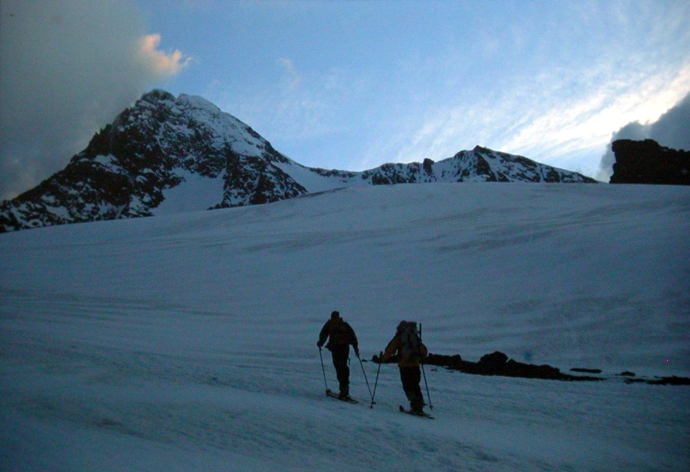 V jutranji senci čez ledenik Koednitzkees, zadaj vršna zgradba Grossglocknerja.