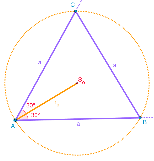 Dani podatki: Enakostranični trikotnik rO = 4,5 cm (polmer očrtane krožnice) 0. Najprej narišemo skico enakostraničnega trikotnika (ne pozabite vse stranice označiti z a in označiti kot 60°, približno vrišemo tudi središče očrtane krožnice). 1. Narišemo krožnico s polmerom rO in središčem SO. 2. Na krožnici izberemo poljubno točko A in narišemo polmer rO. 3. Glede na polmer rO narišemo kot 30° z vrhom v točki A (polovica kota 60°). 4. Narišemo še kot -30° z vrhom v točki A (druga polovica kota 60°). |