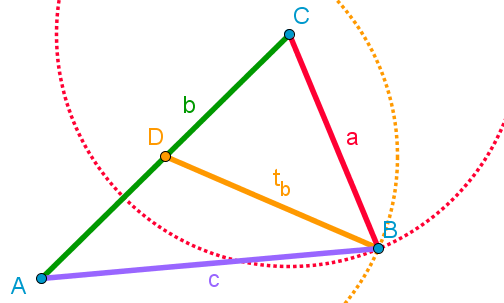 4. Iz točke D narišemo krožni lok polmera tb. 5. V presečišču obeh lokov dobimo točko B. 6. Dorišemo stranici trikotnika ∆ABC.