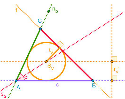 6. Če narišemo tangento t na včrtano krožnico tako, da je pravokotna na polmer rv in iti gre hkrati skozi točko B, dobimo v presečišču z nosilko nb oglišče C (pomagamo si z geotrikotnikom). 7. Dorišemo stranici trikotnika ∆ABC.