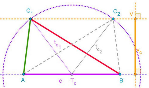 6. S šestilom odmerimo tc in iz točke Tc in narišemo krožni lok. 7. V presečišču z vzporednico dobimo točko C. Ker sta dve taki možnosti, ima naloga dve rešitvi, C1 in C2, torej narišemo dva trikotnika.