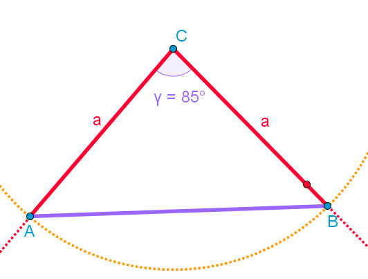 Dani podatki: Enakokraki trikotnik a = 5,5 cm γ = 85° 0. Najprej narišemo skico trikotnika (ne pozabite dorisati, da sta kraka enaka, da sta kota ob osnovnici c enaka), znane količine obkrožimo. 1. Narišemo točko C in narišemo poljuben poltrak. 2. Glede na poltrak in točko C narišemo kot . 3. S šestilom odmerimo dolžino stranice a in narišemo krožni lok, ki seka narisana poltraka.