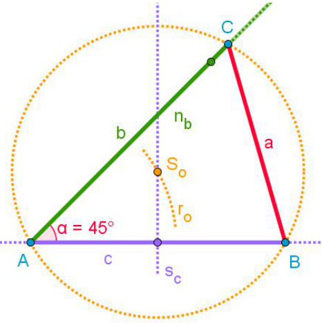 Dani podatki: c = 7 cm α = 45° ro = 4 cm 0. Najprej narišemo skico trikotnika (ne pozabite vrisati očrtanega kroga s polmerom ro), znane količine obkrožimo. 1. Narišemo osnovnico c. 2. V točki A odmerimo kot α in narišemo nosilko nb stranice b. 3. Narišemo simetralo sc na osnovnico c (tj. pravokotnica na razpolovišče stranice c). 4. Iz točke A odmerimo lok ro in v presečišču s simetralo sc dobimo središče očrtane krožnice So. 5. Iz središča So očrtamo trikotniku očrtano krožnico s polmerom ro. |