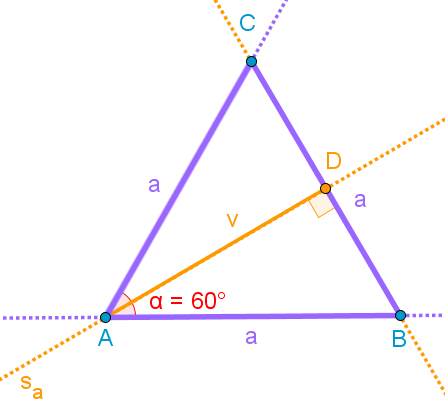 Dani podatki: Enakostranični trikotnik v = 4 cm 0. Najprej narišemo skico enakostraničnega trikotnika (ne pozabite vse stranice označiti z a in označiti kot 60°). 1. Narišemo nosilko bodoče stranice in nekje izberemo točko A. 2. V točki A narišemo kot 60°. 3. Narišemo simetralo kota sa. 4. Na simetrali sa odmerimo višino v in dobimo točko D. 5. V točki D narišemo pravokotnico na simetralo sa. Opomba: nalogo bi še laže rešili, če bi narisali pas, ki ga oriše višina v.