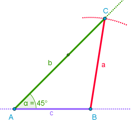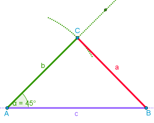 Primer: b = 5 cm c = 7 cm α = 45° 0. Najprej narišemo skico trikotnika, znane količine obkrožimo. 1. Narišemo stranico c. 2. V točki A odmerimo kot α = 45° in narišemo nosilko stranice b. 3. S šestilom odmerimo razdaljo b = 5 cm, ga zapičimo v točko A in narišemo krožni lok. |