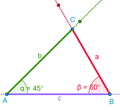 Primer: c = 7 cm α = 45° β = 60° 0. Najprej narišemo skico trikotnika, znane količine obkrožimo. 1. Narišemo stranico c. 2. V točki A odmerimo kot α = 45° in narišemo nosilko stranice b. 3. V točki B odmerimo kot β = 60° in narišemo nosilko stranice a. 5. V presečišču obeh nosilk dobimo točko C. 6. Narišemo ΔABC. |
