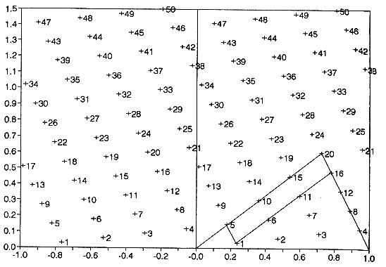 0 in 1 ali blizu nje, vrhi trikotnikov pa so v točkah 5, 20 in 16. Trikotniki
