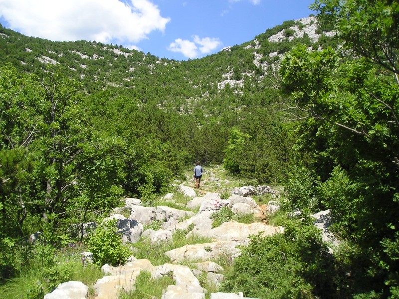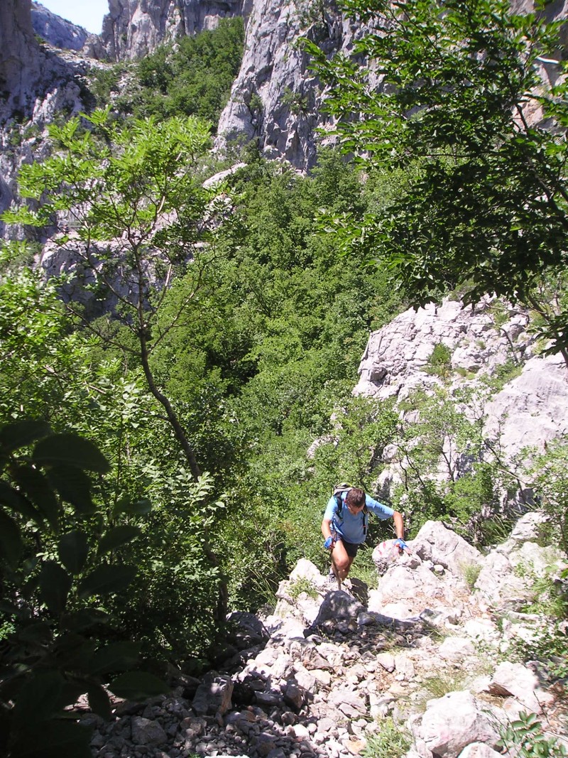 Tukaj pa se tekma dejansko šele začne. Kdorkoli je obiskal Manito Peć (KT4), ve, kaj pomeni ta vzpon po razbeljenih skalah v opoldanskem soncu. Ko tečem mimo turistov, ki ob poti iščejo senco ob nekaj osamljenih drevesih, se mi utrne misel: zakaj rinejo gor v največjum soncu? Nato pomislim na sebe in se zazdim sam sebi nekoliko smešen. Iščem optimum med srčnim utripom in hitrostjo vzpona. Nekje je bilo zapisano, da je temperatura tistega dne v senci dosegla 35°C. S soncem v zatilje postopama izgubljam obtutek užitka, ki ga lahko ponudi neokrnjena narava. Naprej nadaljujem v veliko počasnejšem tempu, pot se počasi izgublja, prav očitno je, da se prehod k Vagancu (KT5) zelo redko uporablja za potešitev avanturističnih apetitov. Nekaj prehodov skozi skale bi lahko ocenil s plezanjem 2. težavnostne stopnje, teren je izrazito kraški, dokaj močno poraščeno ostenje, tako da sem na trenutek močno zmanjšam tempo.