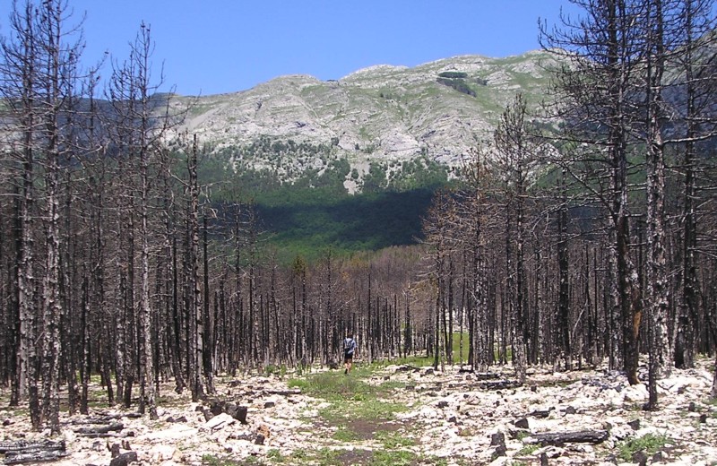 Ko se strmina malo unese, Bojan kot izkušen orientacist hitro najde prehod skozi travnike in popolnoma požgano pobočje, ki spominja na Tungusko. Sledim mu, a z mislijo, da so nekje tukaj nekdanji vojaki JLA zaminirali celotno območje. Nekje višje in je bojda vse označeno... Pa vendar...