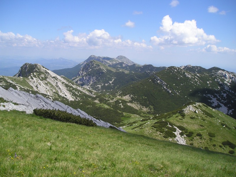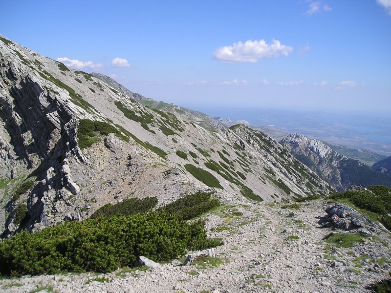 Do vznožja Svetega brda je končno zapiha tudi tista sapica, ki smo jo vsi pogrešali že pri vzponih. Pot skozi ruševje se vije mimo ogromnih rojev muh. Le kje so se tu znašle? Po dobri uri skakanja po grebenu sem se za trenutek usedem. Malce se mi vrti. Stvari so postale resne. Glavo imam motno, potreben je bil pogovor - s samim sabo. Vem, da če predolgo sediš, obsediš, zato sklenem, da bom odmislil svoj samoohranitveni nagon. Zmorem še zadnji vzpon skozi ruševje na rebro, od koder se prehodi v trenutku spremenijo v visokogorsko pot, obdano z melišči in travami...