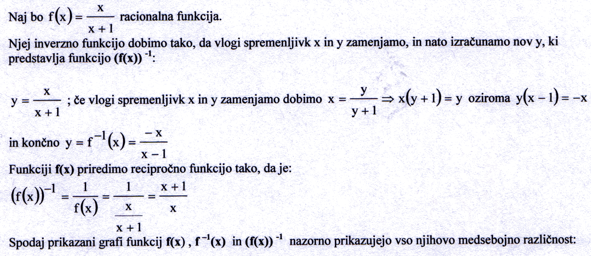 Razliko med f –1(x) - torej inverzno funkcijo h funkciji f(x) in (f(x)) -1, recipročno ali funkcijo f(x) na eksponent –1, si bomo ogledali na primeru.