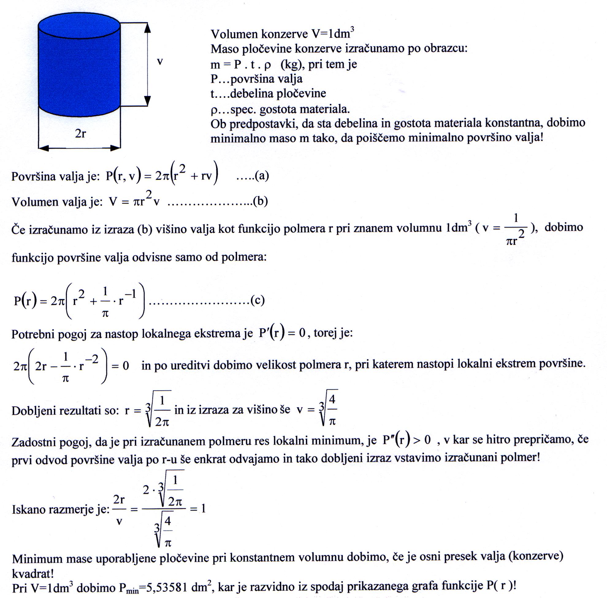 Kakšno je razmerje med premerom in višino konzerve v obliki pokončnega valja, da bi bila pri enoti volumna ( V=1dm