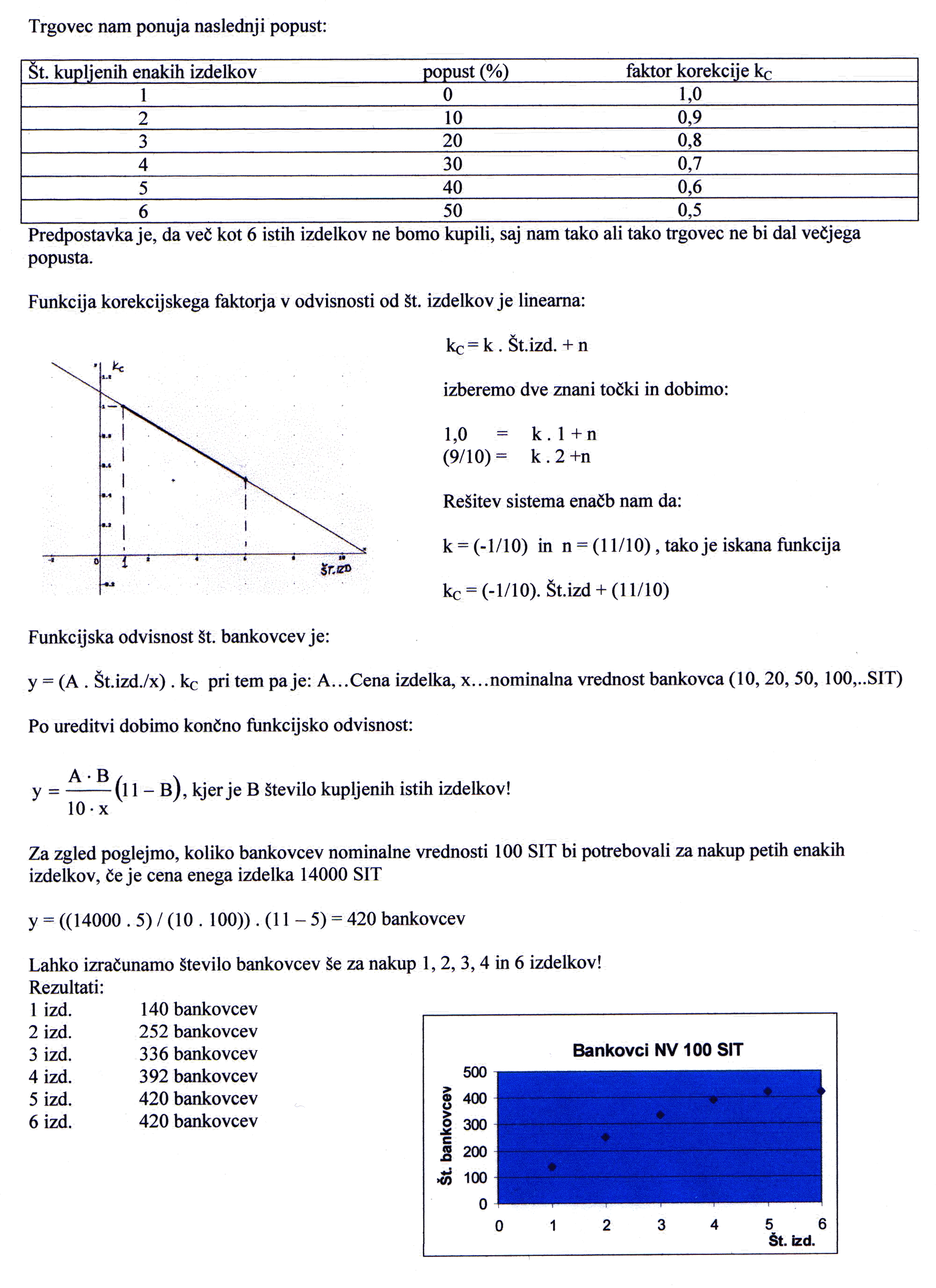 Želimo zapisati funkcijsko odvisnost števila potrebnih bankovcev določene nominalne vrednosti od števila kupljenih enakih izdelkov pri ponujenem popustu na število kupljenih istih izdelkov.
