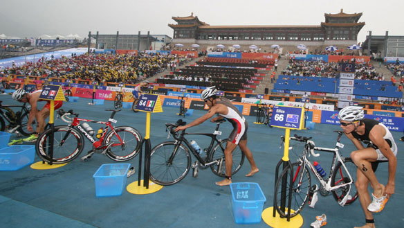 čas pa se štejeta tudi časa obeh menjav – ko tekmovalec preide iz vode na kolo