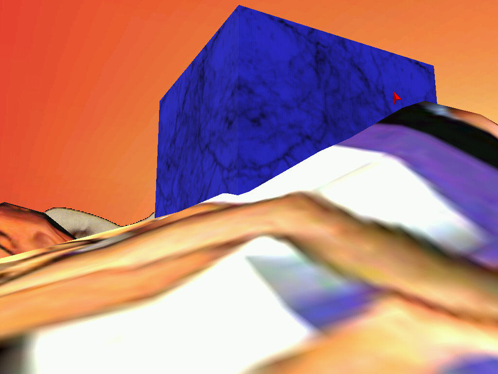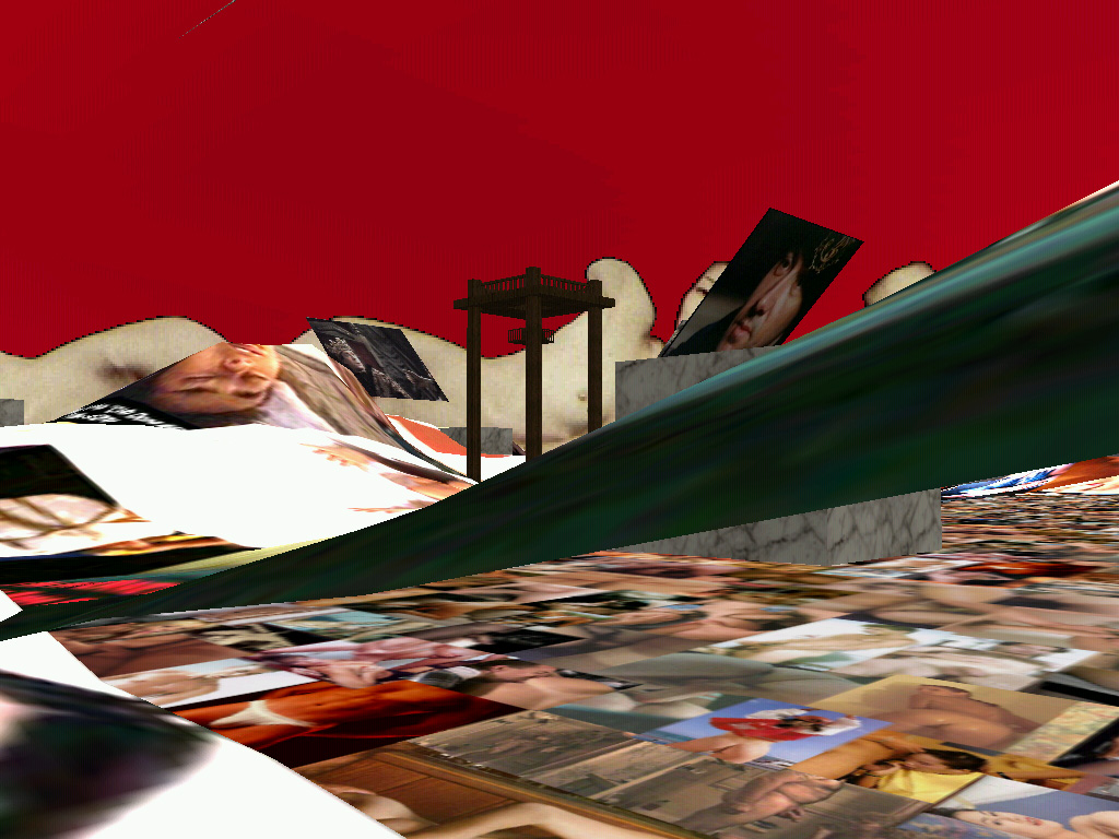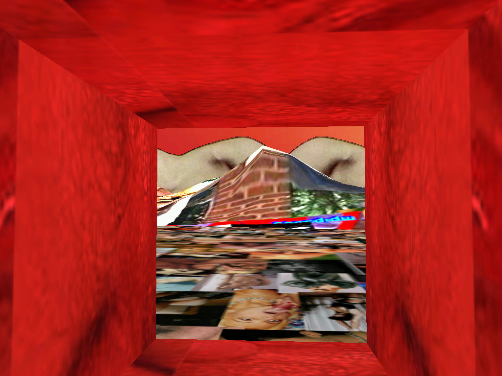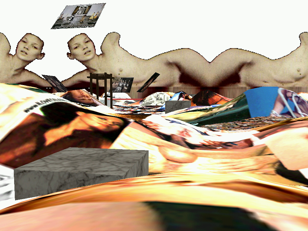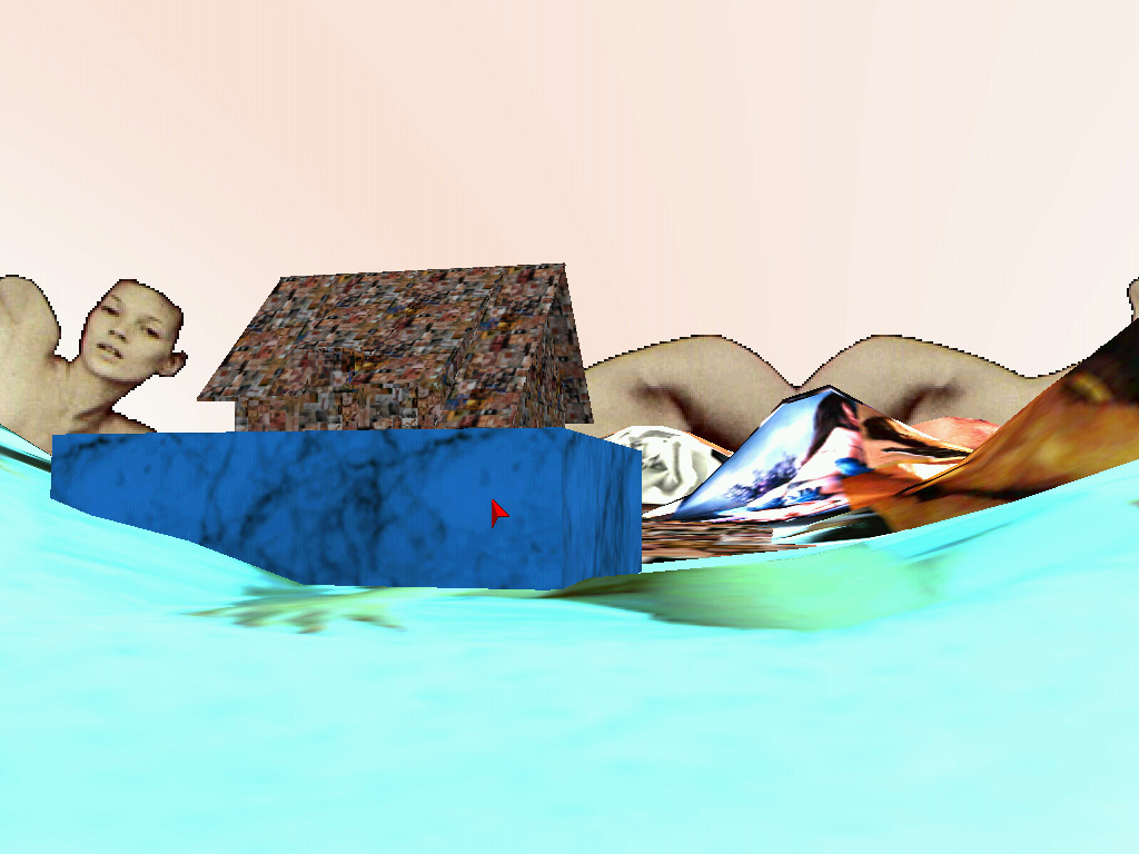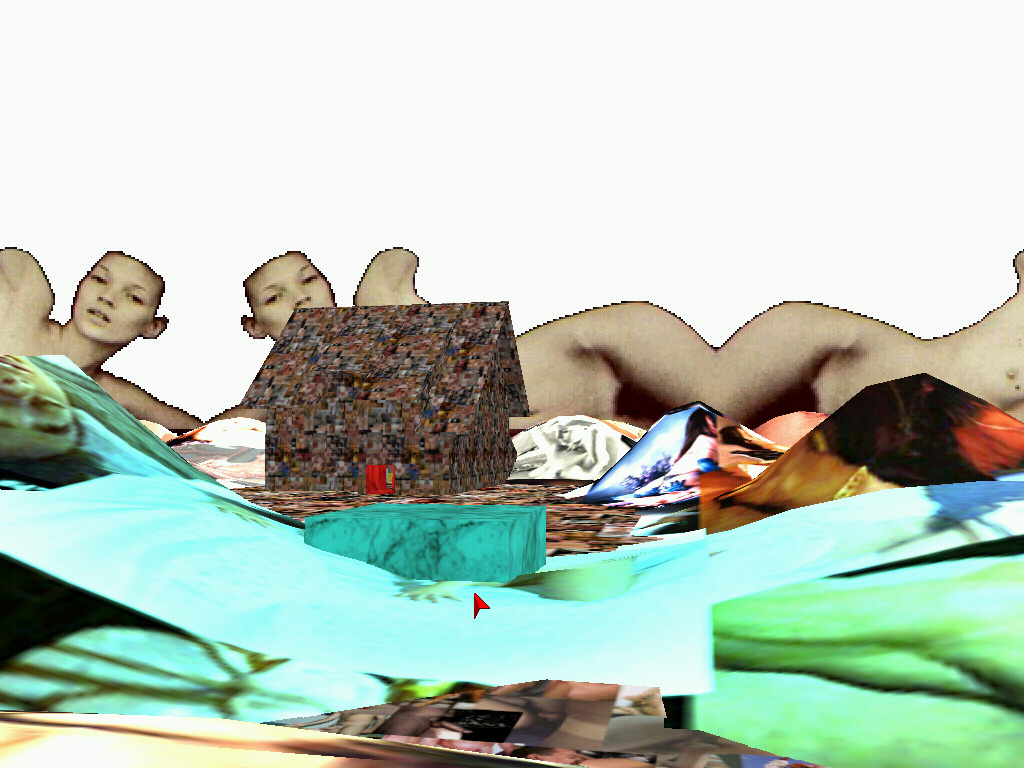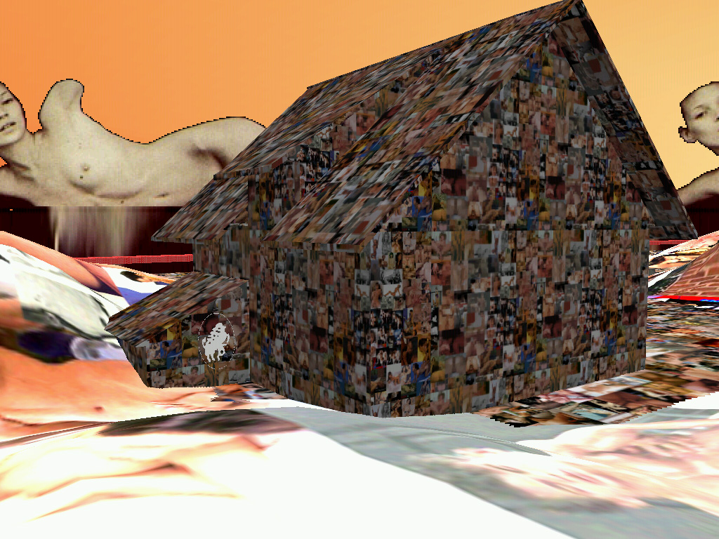 The virtual space of VideoSpace is founded in three elements: the three dimensional objects, the two dimensional textures and the interested gaze which explores the space. Each of the elements is developed through its crucial perceptive aspect: three dimensional objects mimics the three dimensional objects from the real space (eg. the house), textures are not mimetically applied to the objects they cover (eg. the texture of wall bricks is not applied to the object of the house), instead they claim the two-dimensionality, whereas the interested gaze is focuesd into the space itself and it does not disclose its carrier, the avatar. The three dimensional objects and the two dimensional textures are thereby functional in their specific roles and not in the common role of an illusion of the real world. This is in part possible because the three dimensional objects carry enough information about the references to the real world by their three dimensional form alone and would be therefore reduntantly codified if they would mimic real world also on the level of textures.