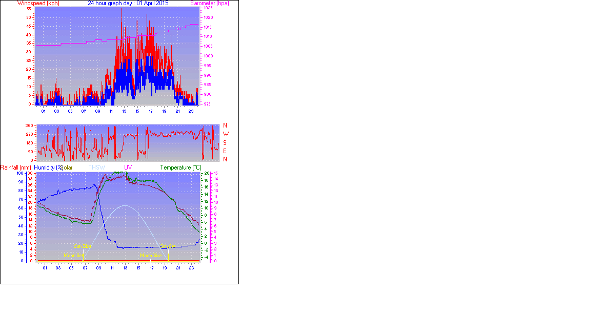 Maximum gust speed = 55.5 km/h from 203°(SSW) on day 01 at time 12:35