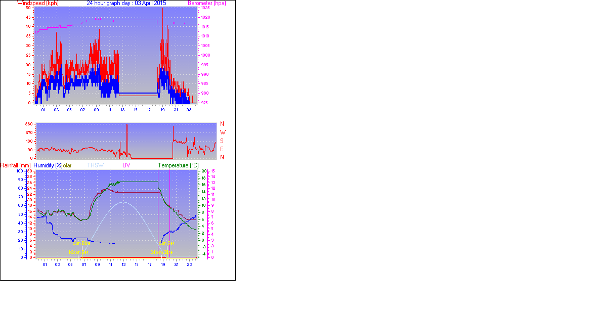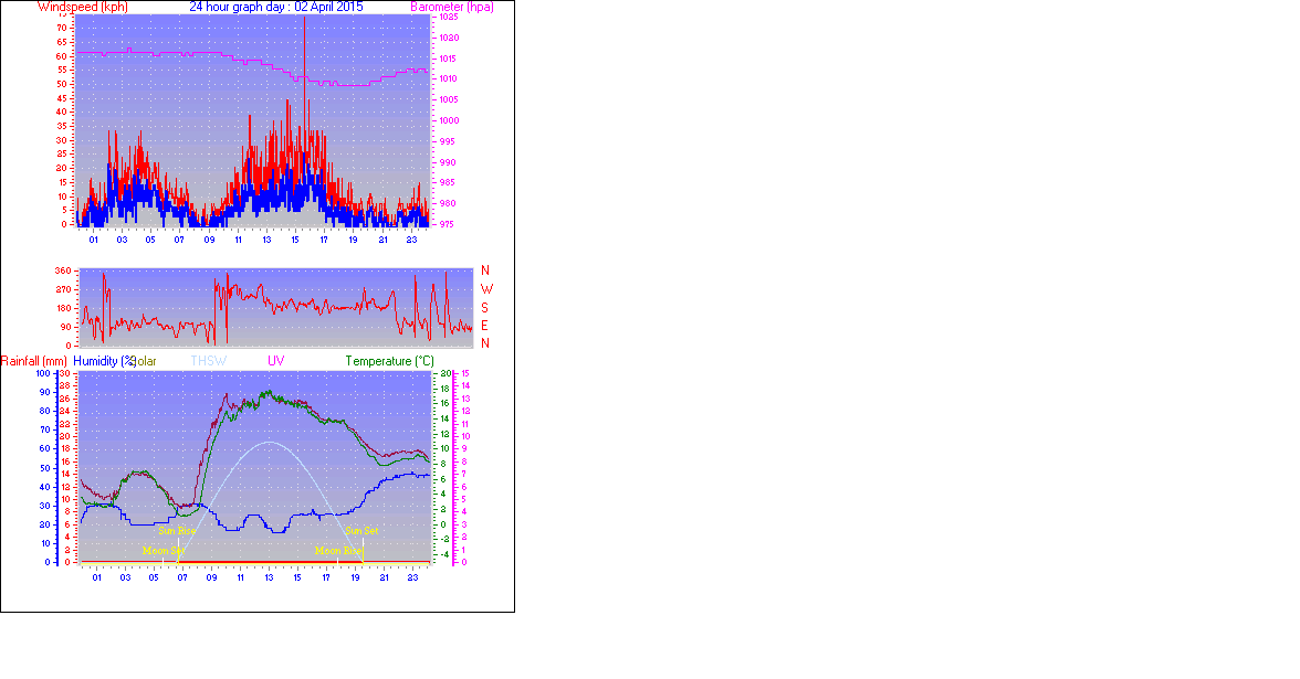 Maximum gust speed = 74.0 km/h from 180°( S ) on day 02 at time 15:37