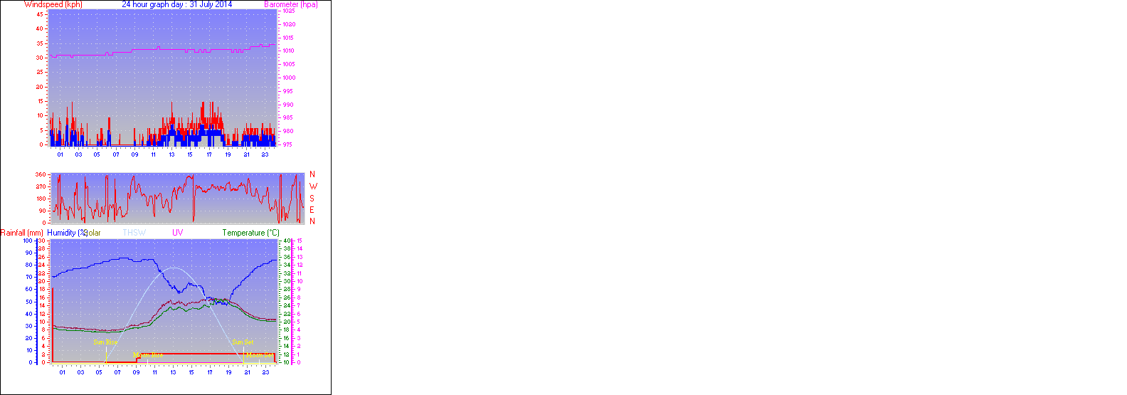 Maximum gust speed = 14.8 km/h from 293°(WNW) on day 31 at time 17:24